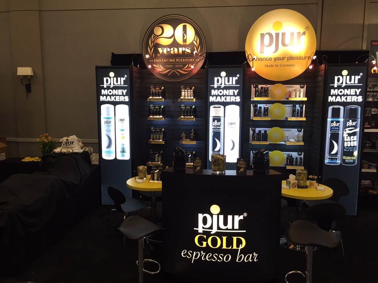 Wasserbillig/Luxembourg, JULI 2015. Der schwarz gelbe pjur Stand zog auf der ANME Founders Show wie immer viele Besucher an, denn als besonderes Messehighlight lag der Fokus in diesem Jahr auf den „Money Makers“, den sechs Produkten, die in den USA am meisten verkauft werden. Sehr gut kamen auch die Give-Aways von pjur an: Hochwertige Leinenbeutel sowie knallgelbe Frisbeescheiben bekam jeder Besucher am Stand des Premiumunternehmens. Eine „pjur Gold Bar“ lud die Händler nebenbei zu einem heißen Espresso ein.