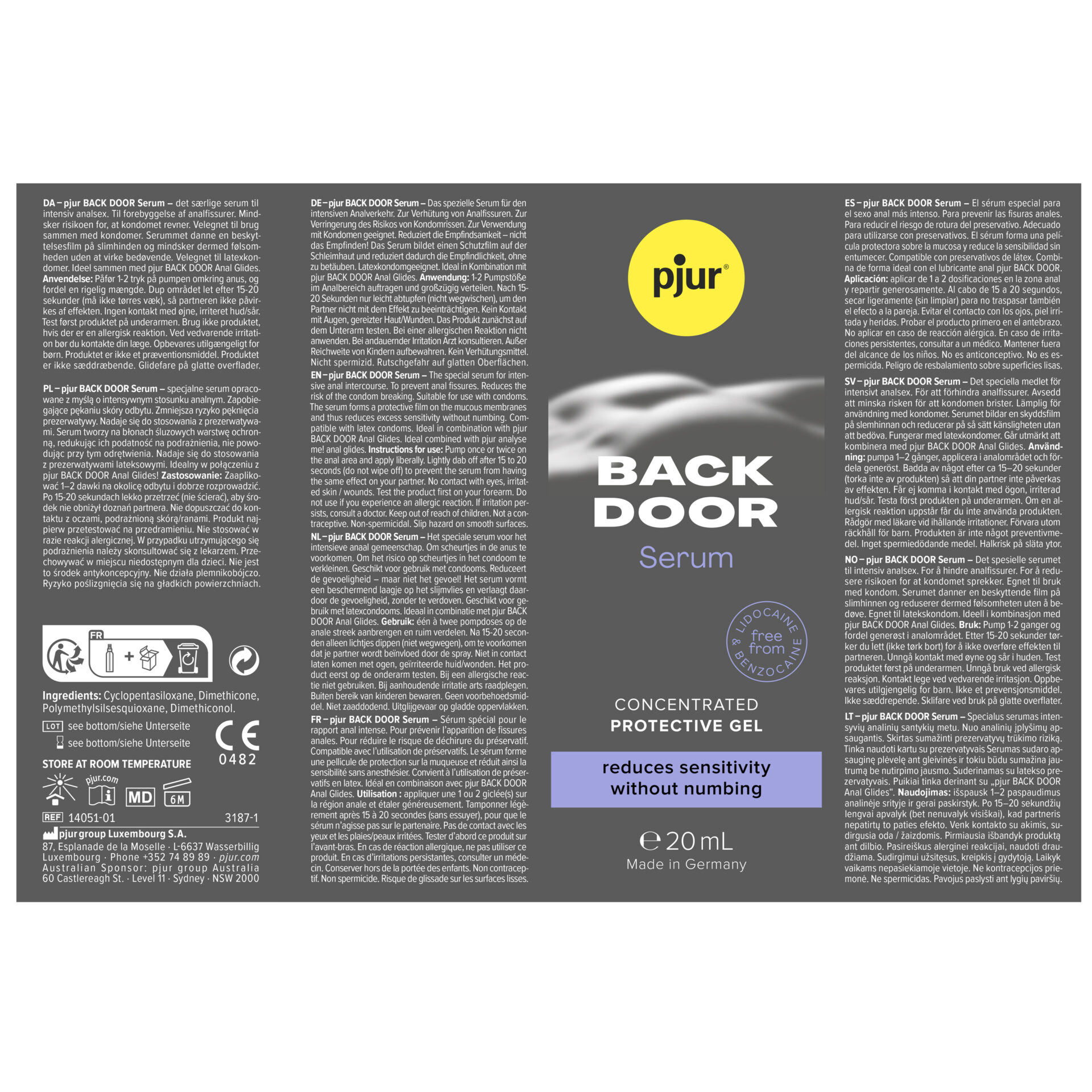 pjur BACK DOOR Serum was specially developed for intensive anal sex and is therefore dosed in a high concentration. Because it does not contain lidocaine or benzocaine, this serum does not have a numbing effect. Instead it forms an invisible protective film on the mucous membrane that reduces sensitivity during sex but not sensations you experience. This product is compatible with latex condoms. It is not a contraceptive. Perfect in combination with pjur BACK DOOR Anal Glides.